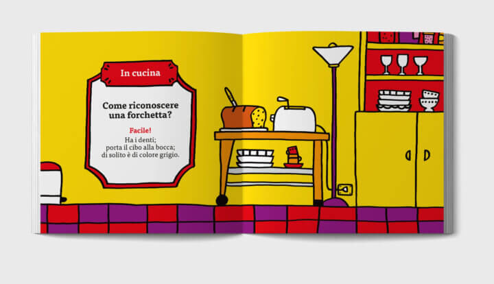 Così, spostandoci nelle coloratissime stanze disegnate da Silvia Borando, possiamo di volta in volta riconoscere gli oggetti seguendo dei chiarissimi suggerimenti (impossibile sbagliare!).