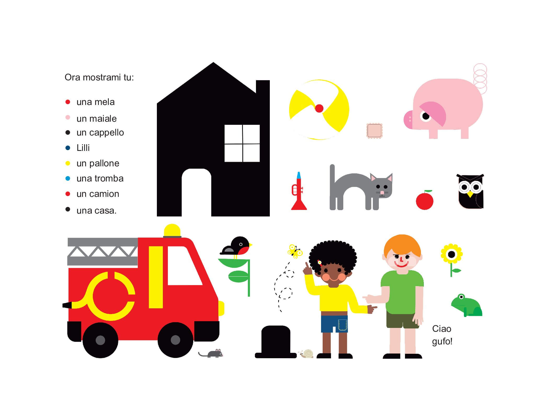 Ma l’interazione non si ferma solo ai nomi delle immagini, perché dopo aver nominato tutti i soggetti, dopo aver usato il libro come un primo dizionario e dopo aver imparato i colori primari e secondari, il bambino che cresce può divertirsi a riconoscere le azioni, a cercare i dettagli nascosti o rispondere alle domande. In questo modo il libro diventa un compagno di giochi durante tutte le fasi dello sviluppo.