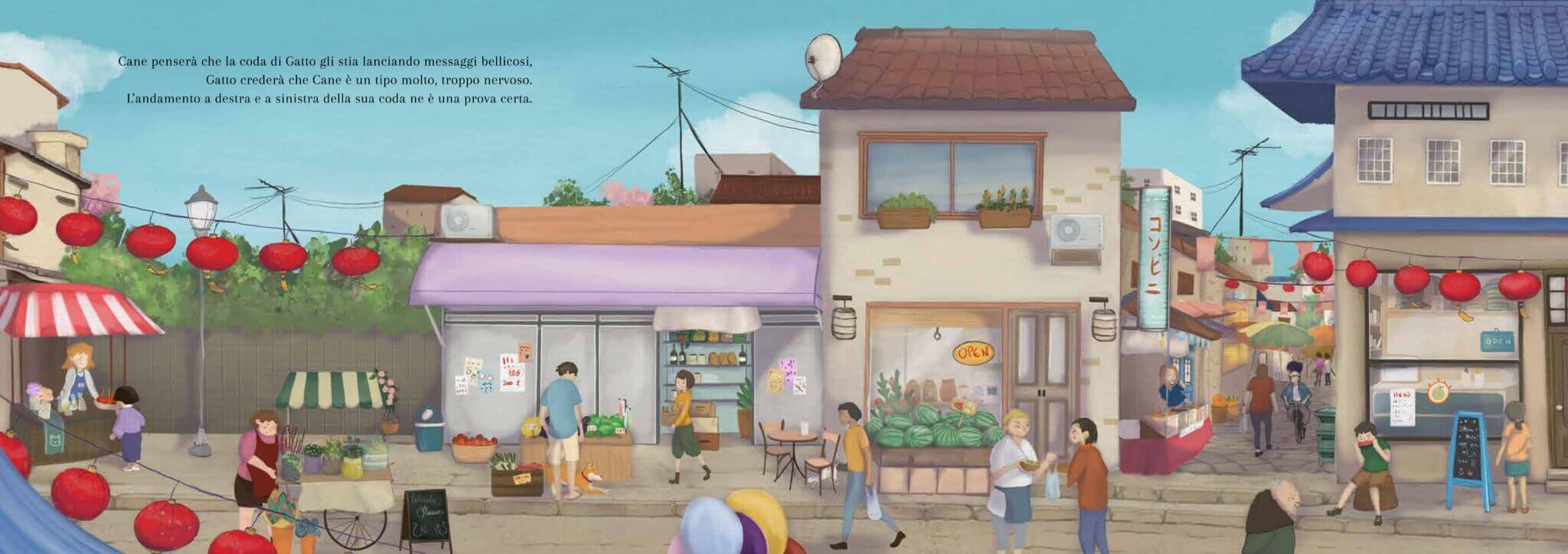 Però se un giorno Gatto capisse quella coda canina così nervosa e se un giorno Cane studiasse a fondo quell’immobile coda felina che si piega come un punto interrogativo? Forse quel giorno i due animali si racconterebbero i segreti delle loro code e (sempre forse) comincerebbero a capirsi.