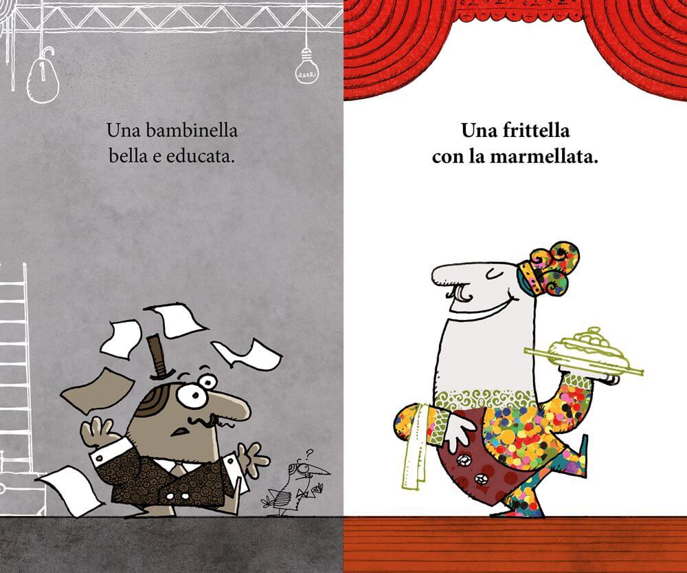 Ma non finisce qui, perché Olivotti non si limita al gioco linguistico. L’assurdità del testo viene amplificata da un andirivieni di oggetti di scena che compaiono dal nulla sulla pagina di destra. Ogni parola fraintesa evoca un oggetto reale che segue il ritmo incalzante della recitazione, in un crescendo di gesti e nonsense che trasformano quello che doveva essere un monologo drammatico in una performance d’avanguardia acclamata dal pubblico (decisamente sbigottito).