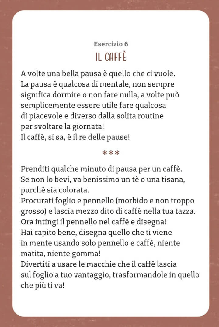 Tanti spunti da cui partire: la casa, il caffè, il pennello, la mappa, la scala, l’albero, la porta e tanti suggerimenti su come procedere, osservare, stravolgere, personalizzare, appuntare e immaginare… perché non si sa mai da dove può nascere un’idea creativa!