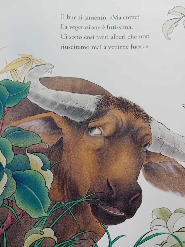 Mentre ci perdiamo nella bellezza delle illustrazioni di Regina Linke, artista taiwanese-americana maestra nell’arte del gongbi (pittura realistica cinese), anche noi lettori cominciamo a domandarci come un bambino così piccolo possa affrontare un animale tanto grande. E se lo chiedono pure le rondini, che lo avvertono di non tirare l’animale per le corna e poi la rana in riva al laghetto, che gli suggerisce di non camminare dietro il bovino che potrebbe spaventarsi.