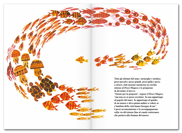 Il pesce magico nel mare è ammirato da tutti per le sue scaglie lucenti, ma anche per il suo coraggio e le creature marine lo invitano a restare. Però il pesce magico non appartiene a quel posto, lui vive dentro la cornice del quadro e il suo compito è quello di rendere felici i bambini che frequentano il museo (non è forse questo lo scopo dell’arte?).