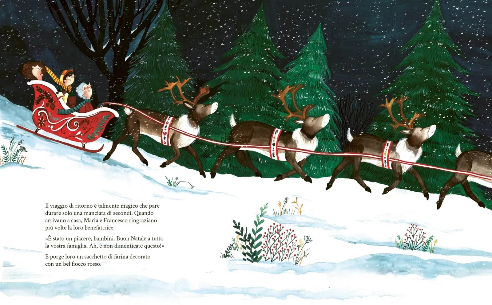 Un racconto che profuma di biscotti e di Vigilia di Natale, dove i coloratissimi disegni naif di Marilyn Faucher si fondono con l’avventura di Maria e Francesco, regalando al lettore la bellezza del bosco notturno (anche quando fa paura), un fondale poetico che si svela in ogni pagina.