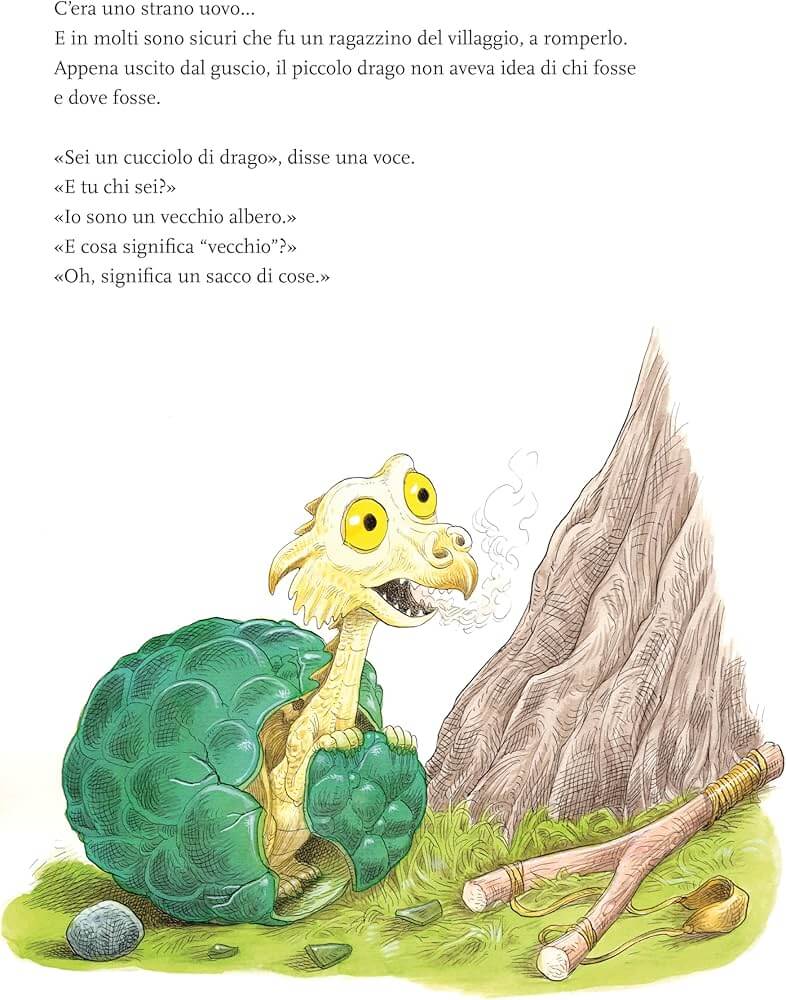 Così il piccolo drago cresce all’ombra dell’albero, inizia a osservare il mondo esterno, soprattutto gli esseri umani, creature bizzarre, piuttosto pericolose, che però condividono con lui due grandi passioni: il desiderio di collezionare oggetti e il fascino distruttivo del fuoco.