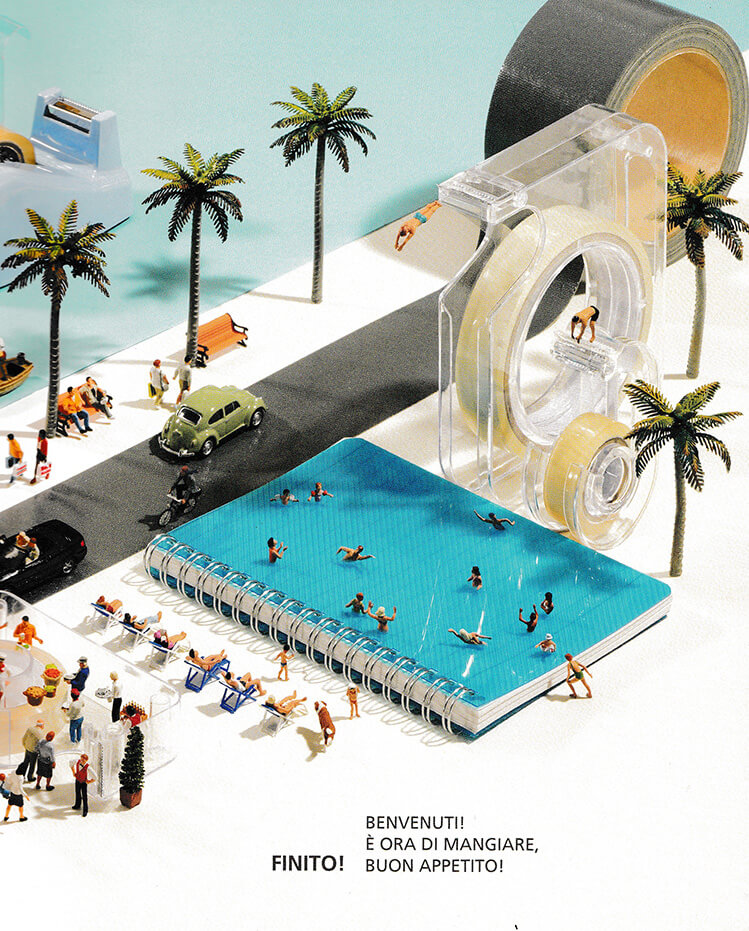 Articoli da ufficio, libri, strumenti musicali, parti elettroniche e cibi di ogni forma e tipo che siamo abituati a vedere altrove, diventano i veri protagonisti di questi diorami, abitati da omini (rigorosamente in scala) che costruiscono, lavorano, viaggiano, si arrampicano, nuotano, corrono e si divertono.