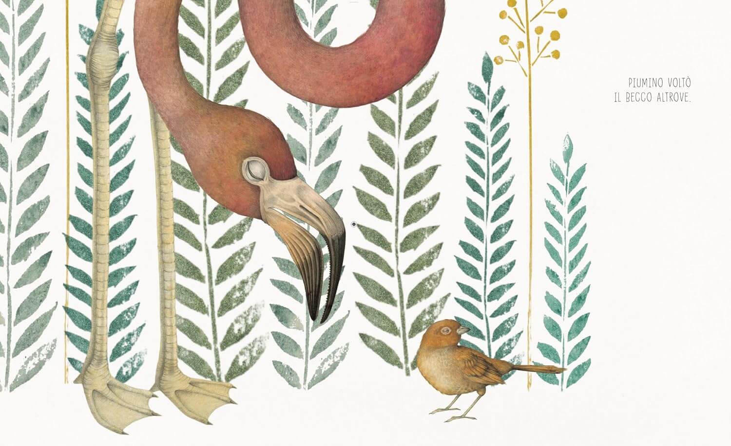 Un libro in stampatello maiuscolo con disegni naturalistici estremamente dettagliati, dove il contrasto visivo è fondamentale: la piccola massa scura e tonda del passero contro le linee lunghe, eleganti e quasi geometriche del fenicottero. Ma quando Rosita entra nella colonia, le illustrazioni cambiano ritmo: non è più un dialogo tra due individui, ma un chiassoso coro rosa.