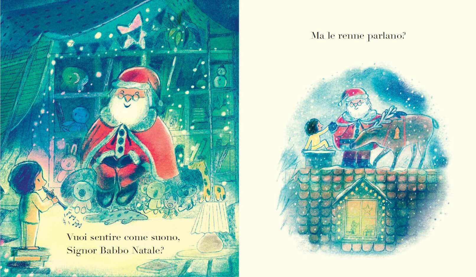 Babbo Natale non risponde, perché sa che i bambini appena hanno formulato una domanda sono già proiettati verso quella successiva, però ascolta la sua piccola ospite e lo fa tutta la notte!