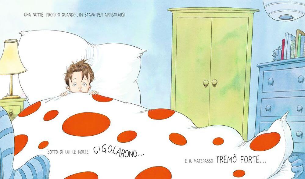 Ci sono i mostri gemelli che vivono nel primo cassetto, c’è il mastino dell’armadio, ci sono il coniglio del comodino, l’elefante dietro le tende e i tre che vivono nel baule dei giocattoli, e tutti (ma proprio tutti) sono d’accordo su una cosa: il letto di Jim è il posto più invitante di tutta la stanza!
